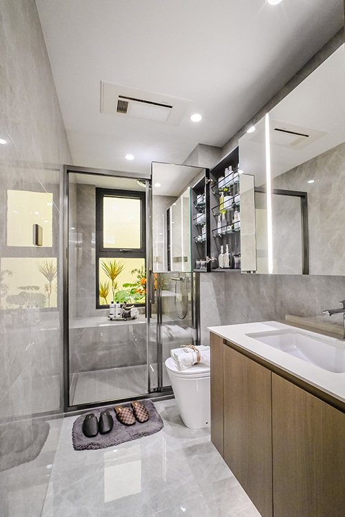 在收纳系统设计上,满足收纳容量同时,我们增加很多提升幸福感的小细节。独立玄关设计了多元化的收纳功能,增加鞋柜除菌功能,主卫镜柜配置美妆冰箱。